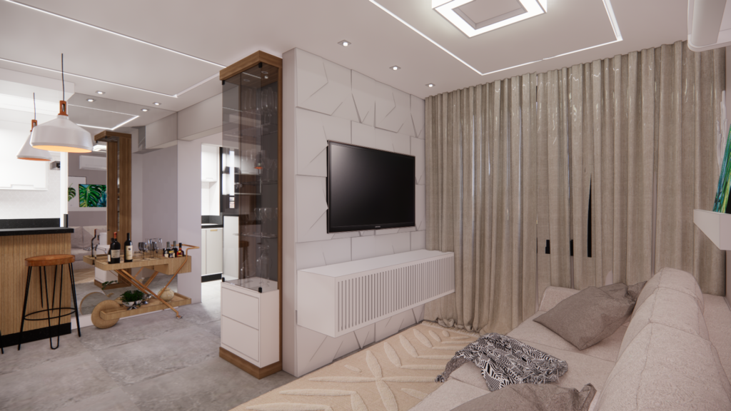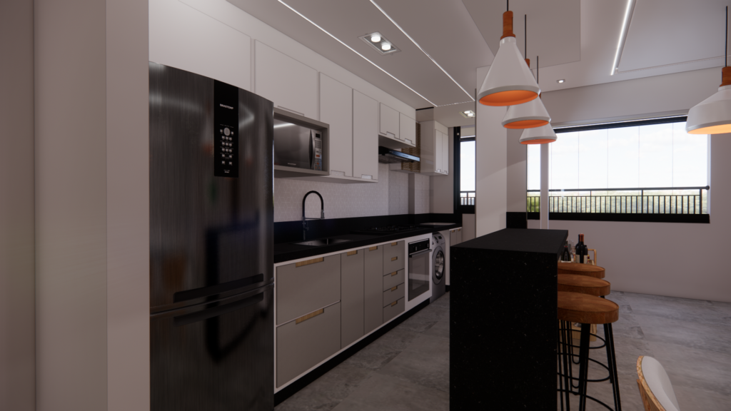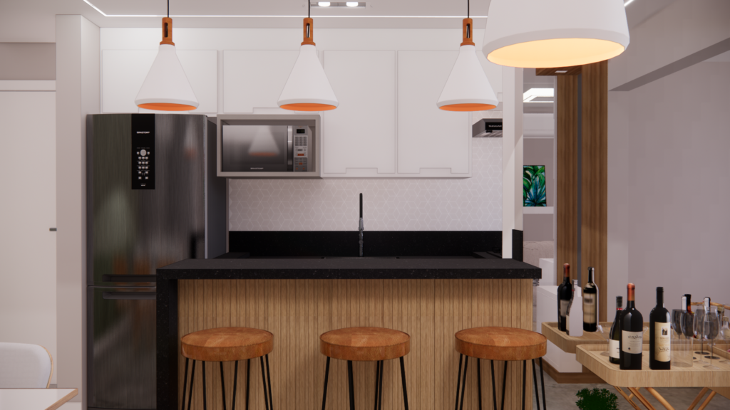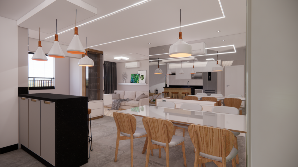 Este apartamento foi pensado para ser contemporâneo, clean e acolhedor ao mesmo tempo. A reforma prioriza integração e amplitude, com poucos materiais bem definidos para dar unidade: base neutra, madeira/ripado trazendo calor e preto pontuando sofisticação nas bancadas e detalhes. A iluminação linear no forro desenha os ambientes e valoriza a arquitetura, enquanto os pendentes e luzes indiretas criam um clima confortável para o dia a dia. O resultado é um espaço funcional, elegante e atemporal, feito para viver e receber com leveza.