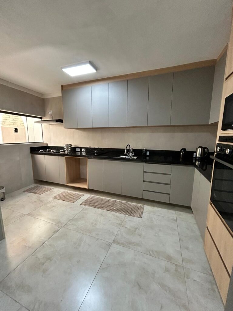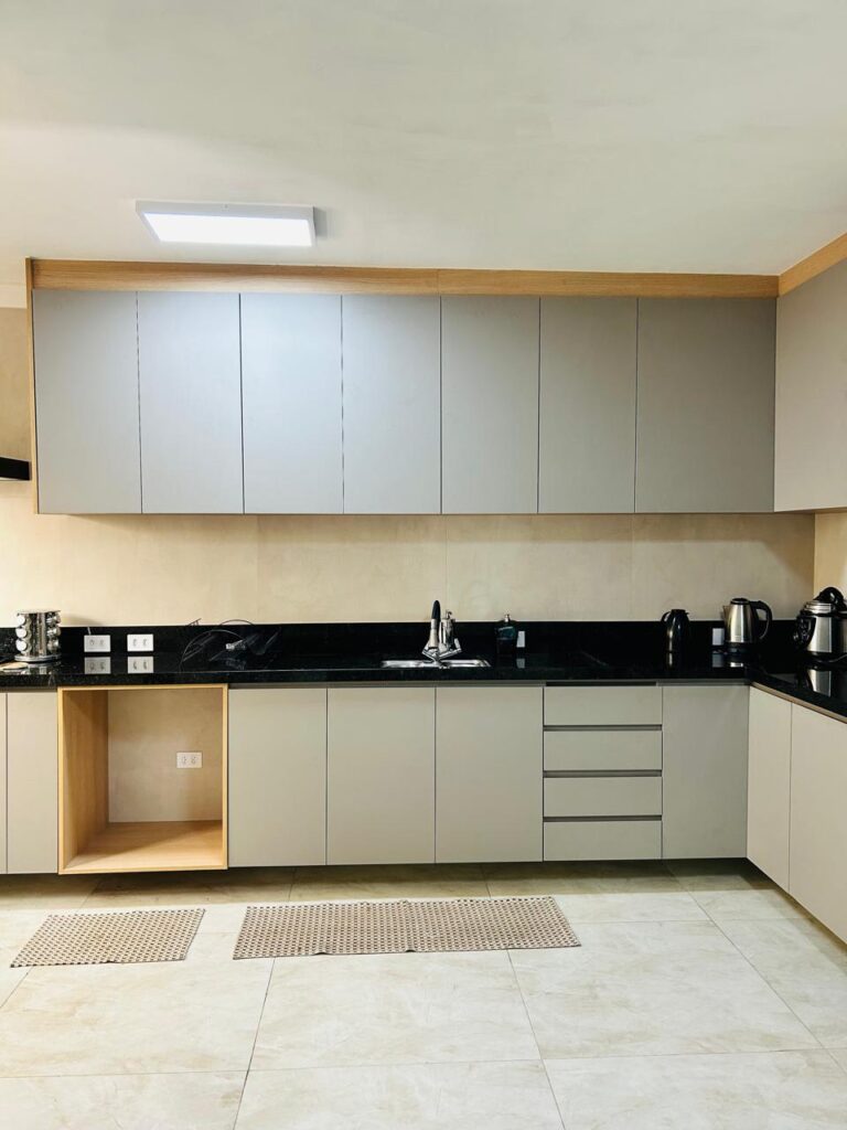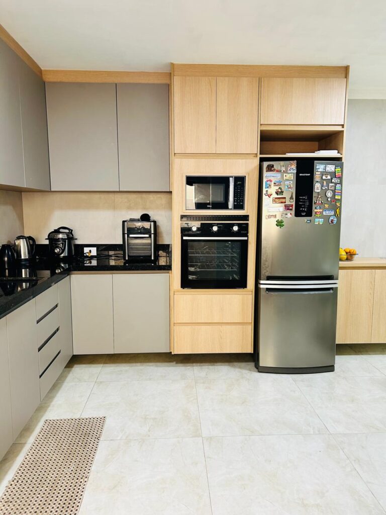 Cozinha contemporânea marcada pela sobriedade e funcionalidade. A paleta neutra, combinada à marcenaria em tons claros e ao uso pontual da madeira, cria uma atmosfera elegante e atemporal. As superfícies contínuas, os volumes limpos e a integração dos eletrodomésticos reforçam a estética minimalista, priorizando praticidade, organização e conforto no uso diário.